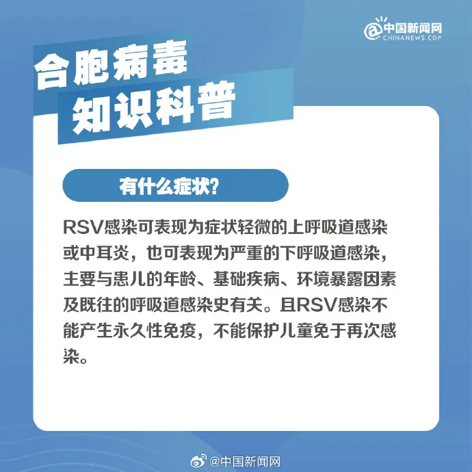 不外,6月龄以内早产儿、免疫力较弱的少部分患儿,感染后更容易出现中重度症状。严重时还可导致肺炎、呼吸枯竭、脑炎等疾病,致使物化。